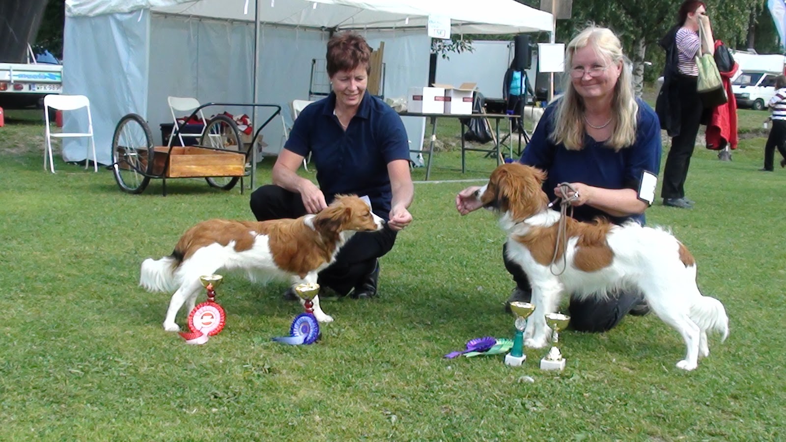 Sitten meni kehään Merlinin kaunis sisko Nella. Se meni tosi hienosti ja sai myös kp:n. Sitten oltiinkin jo samassa kehässä, jossa Nellasta tuli ROP ja Merlinistä VSP. Arvostelut olivat todella hyvät molemmilla, Merlinin: hyvin lupaava urospentu, lupaava pää, erittäin hyvät luut, hyvä pigmentointi, hyvät kulmaukset, nätti tyypillinen turkki, erittäin hyvä temperamentti, ontuu toista etujalkaa.